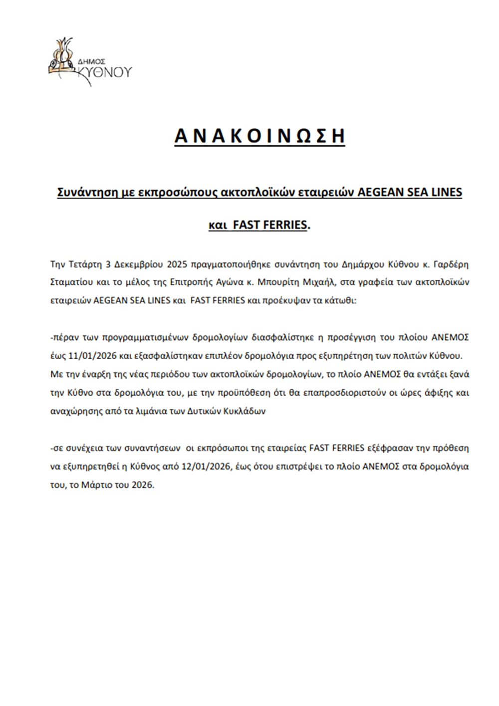 Παράλληλα, οι εκπρόσωποι της FAST FERRIES εξέφρασαν την πρόθεση η Κύθνος να συνεχίσει να εξυπηρετείται από την εταιρεία έως τις 12 Ιανουαρίου 2026, ενώ το “ΑΝΕΜΟΣ” θα επιστρέψει κανονικά στα δρομολόγιά του από τον Μάρτιο του 2026.