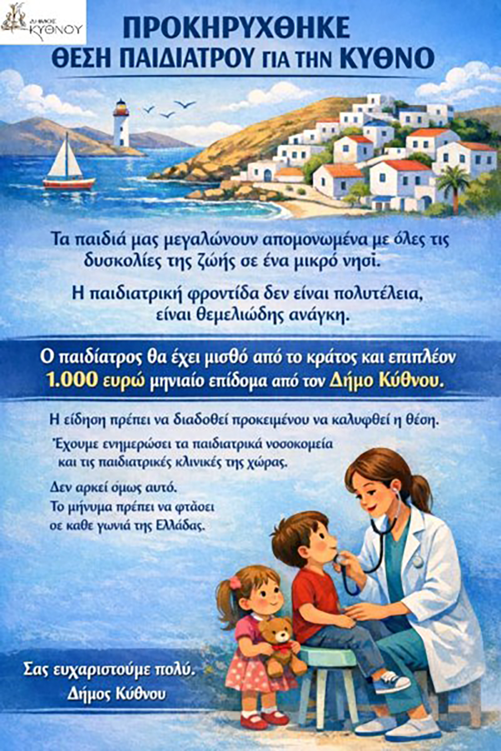 Ο δήμος Κύθνου απευθύνει δημόσια έκκληση για την κάλυψη θέσης παιδιάτρου στο νησί, προσφέροντας, πέρα από τον μισθό που προβλέπεται από το κράτος, μηνιαίο επίδομα ύψους 1.000 ευρώ από ίδιους πόρους.