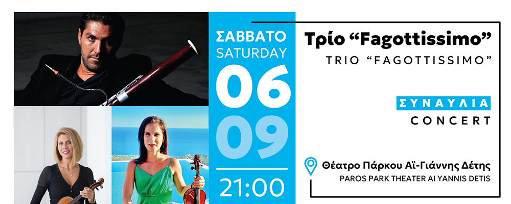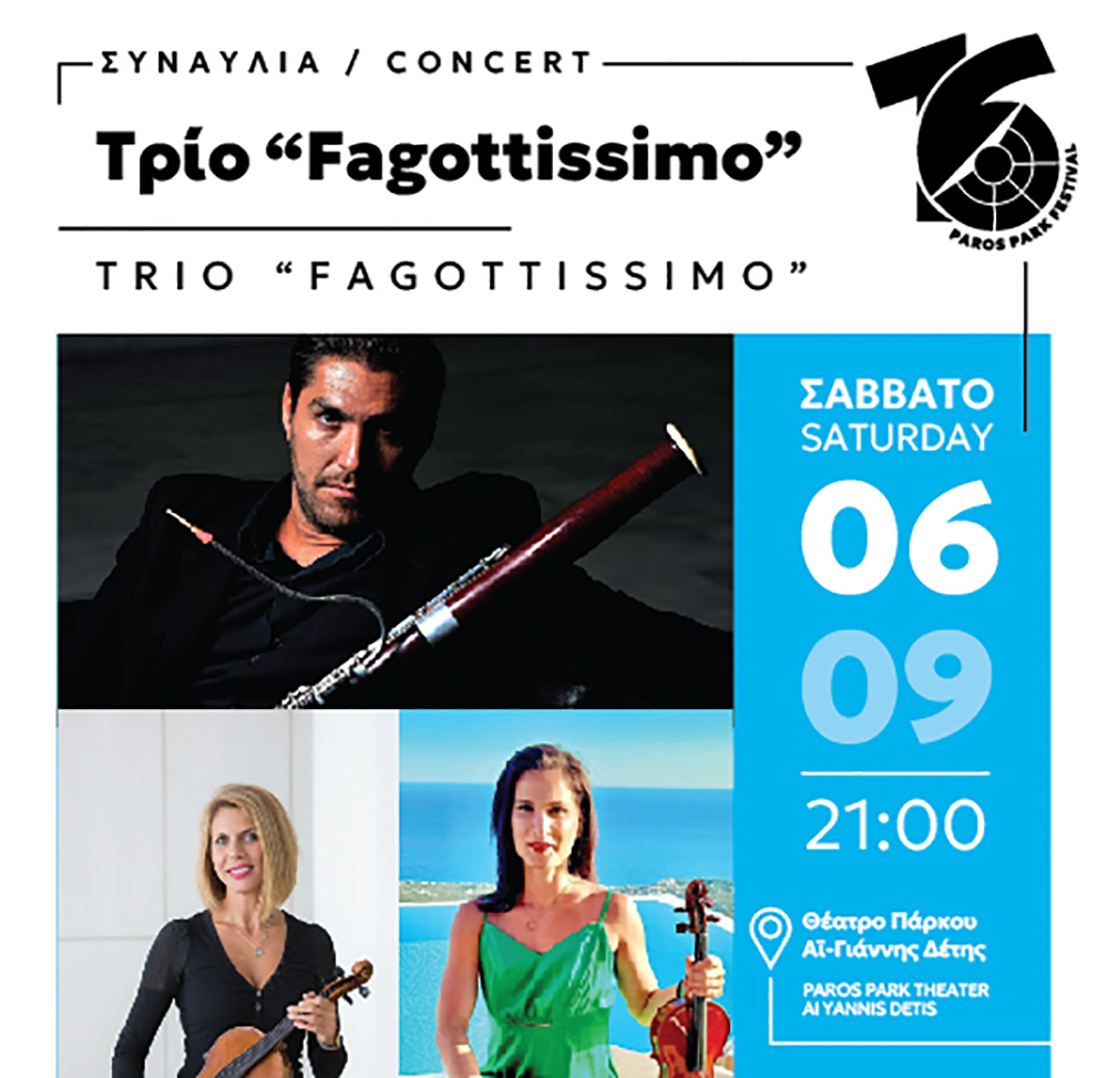 Το Πάρκο Πάρου παρουσιάζει το Trio Fagottissimo, με μια ξεχωριστή συναυλία μουσικής δωματίου με κλασικό και νεοκλασικό ρεπερτόριο, όπου οι κορυφαίοι μουσικοί από την Κρατική Ορχήστρα Αθηνών, η Ιωάννα Γαϊτάνη (βιολί), η Κέλλη Άντζελα Κοκολάνη (βιόλα) και ο Αλέξανδρος Οικονόμου (φαγκότο) θα ερμηνεύσουν έργα για τρίο εγχόρδων, με την ιδιαίτερη καινοτομία της αντικατάστασης του βιολοντσέλου από το φαγκότο, το Σάββατο 06 Σεπτεμβρίου 2025, στις 21:00, στο Θέατρο του Πάρκου Άη-Γιάννης Δέτης.
