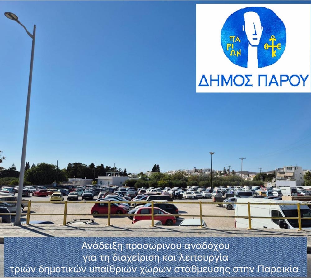 Ο Δήμος Πάρου ανακοινώνει ότι, στη συνεδρίασή της στις 29 Οκτωβρίου 2025, η Δημοτική Επιτροπή ενέκρινε ομόφωνα τα Πρακτικά Νο Ι και Νο ΙΙ του ανοικτού ηλεκτρονικού διαγωνισμού για την παροχή υπηρεσιών με τίτλο: «Παροχή υπηρεσιών διαχείρισης και λειτουργίας τριών δημοτικών υπαίθριων χώρων στάθμευσης οχημάτων στην Παροικία της Δημοτικής Κοινότητας Πάρου του Δήμου Πάρου», εκτιμώμενης αξίας 540.000,00 € πλέον Φ.Π.Α.