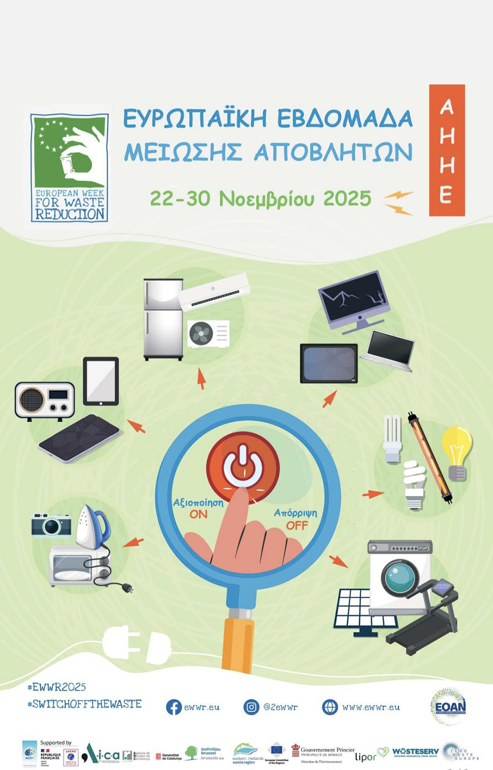 Με σύνθημα «Αξιοποίηση ON – Απόρριψη OFF», ενώνουμε τις δυνάμεις μας με Οργανισμούς Τοπικής Αυτοδιοίκησης, δημόσιους φορείς, ΜΚΟ, εκπαιδευτικά ιδρύματα, επιχειρήσεις και πολίτες σε όλη την Ευρώπη, με στόχο την προώθηση της Μείωσης, Επαναχρησιμοποίησης και Ανακύκλωσης υλικών (Reduce – Reuse – Recycle).