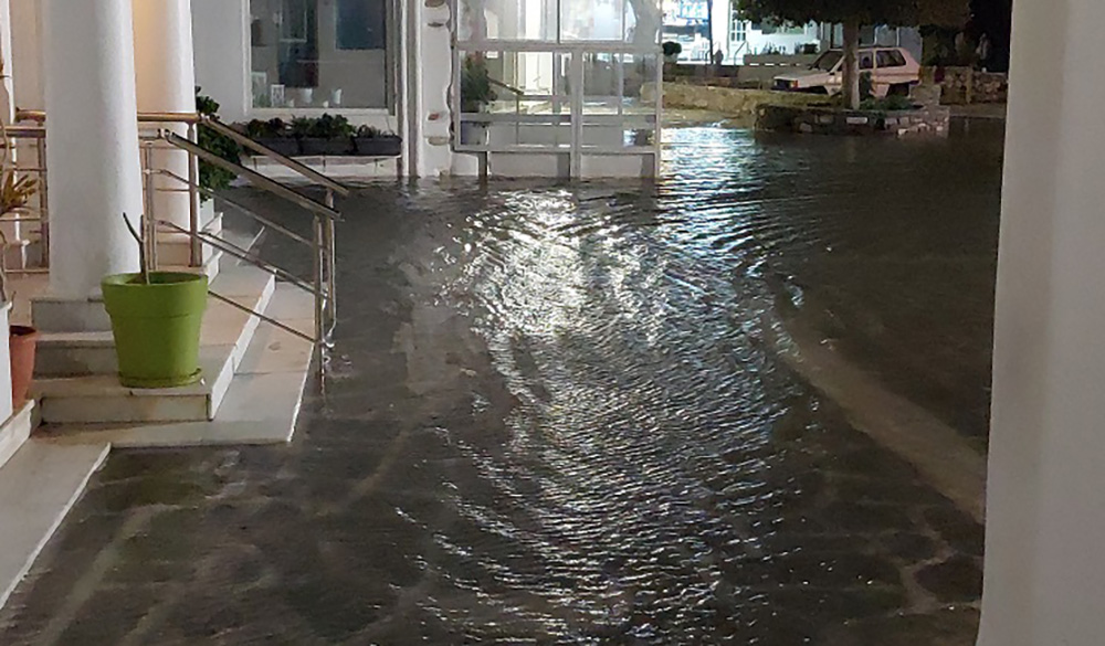 Η πλατεία Ζωοδόχου Πηγής στην Παροικία πλημμύρισε και μέρος της παραλιακής οδού έγινε αδιάβατο «ποτάμι» για πεζούς και οχήματα.