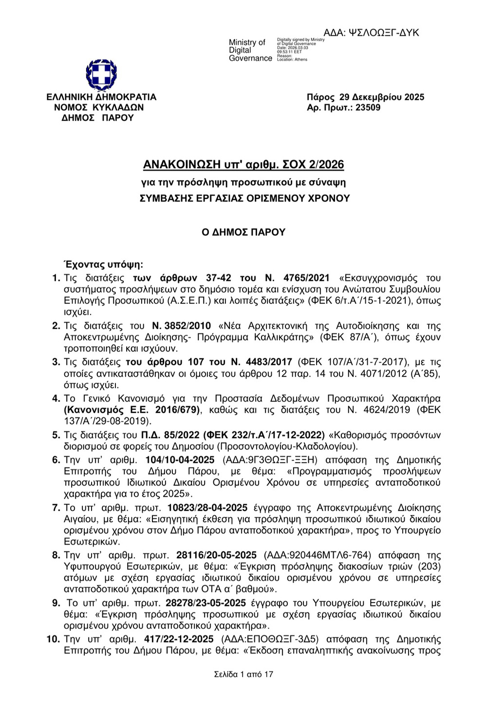Ο Δήμος Πάρου, σύμφωνα με την υπ’ αρ. ΣΟΧ 2/2026, με αρ. πρωτ. 23509/ 29-12-2025 (ΑΔΑ: ΨΣΛΟΩΞΓ-ΔΥΚ) Ανακοίνωση, θα προβεί στην πρόσληψη συνολικά είκοσι έξι (26) ατόμων για την παροχή υπηρεσιών ανταποδοτικού χαρακτήρα, με σύμβαση εργασίας ιδιωτικού δικαίου ορισμένου χρόνου στην Υπηρεσία Καθαριότητας.