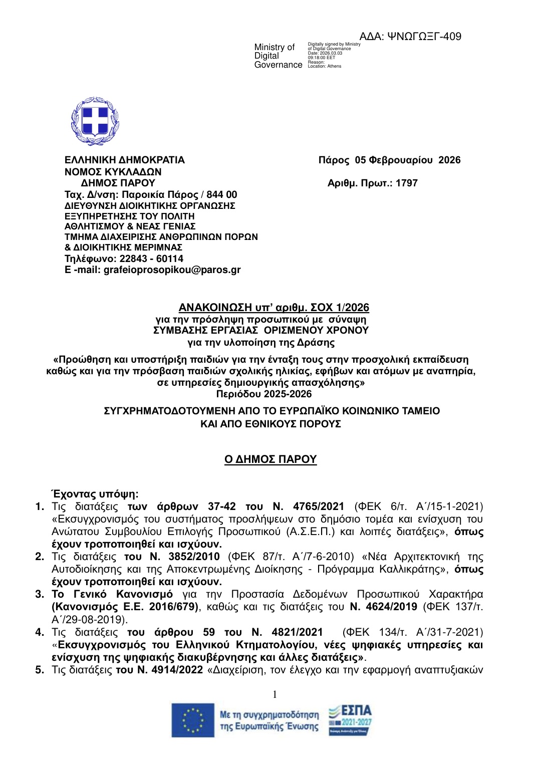 Ο Δήμος Πάρου ανακοινώνει την πρόσληψη προσωπικού με σύναψη Σύμβασης Εργασίας Ιδιωτικού Δικαίου Ορισμένου Χρόνου (ΣΟΧ), σύμφωνα με την υπ’ αριθμ. ΣΟΧ 1/2026 ανακοίνωση, για την υλοποίηση της Δράσης «Προώθηση και υποστήριξη παιδιών για την ένταξή τους στην προσχολική εκπαίδευση καθώς και για την πρόσβαση παιδιών σχολικής ηλικίας, εφήβων και ατόμων με αναπηρία σε υπηρεσίες δημιουργικής απασχόλησης» περιόδου 2025-2026, η οποία συγχρηματοδοτείται από το Ευρωπαϊκό Κοινωνικό Ταμείο και από Εθνικούς Πόρους.