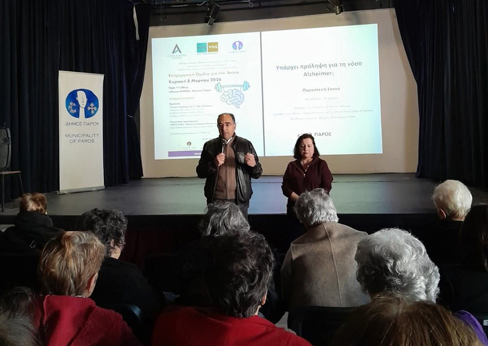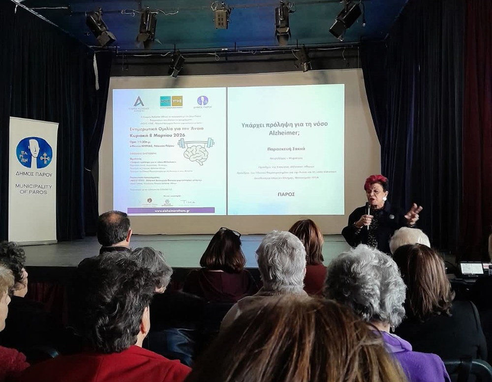 Με μεγάλη συμμετοχή και ιδιαίτερο ενδιαφέρον από τους πολίτες πραγματοποιήθηκε η ενημερωτική ομιλία για την άνοια στην κατάμεστη αίθουσα του Νηρέα, που διοργάνωσε ο Δήμος Πάρου σε συνεργασία με την Εταιρεία Alzheimer, στο πλαίσιο του προγράμματος «Νους Υγιής – Πιλοτική λειτουργία Δικτύου Γυμναστηρίων Μνήμης».