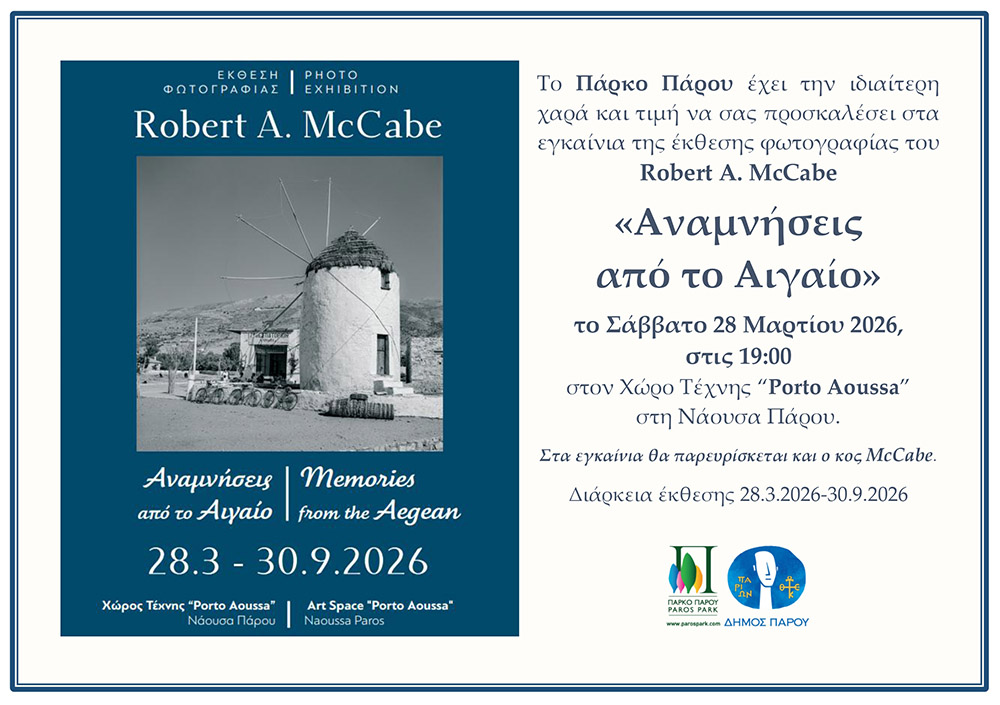 Από τις 28 Μαρτίου έως τις 30 Σεπτεμβρίου 2026, στον χώρο τέχνης Porto Aoussa στη Νάουσα Πάρου, φιλοξενείται η έκθεση «Αναμνήσεις από το Αιγαίο» του διεθνούς φήμης φωτογράφου Robert A. McCabe, με 82 επιλεγμένες φωτογραφίες που ο ίδιος ο δημιουργός επέλεξε ειδικά για την Πάρο, σε συνεργασία με τον επιμελητή της έκθεσης Κώστα Βιδάκη.