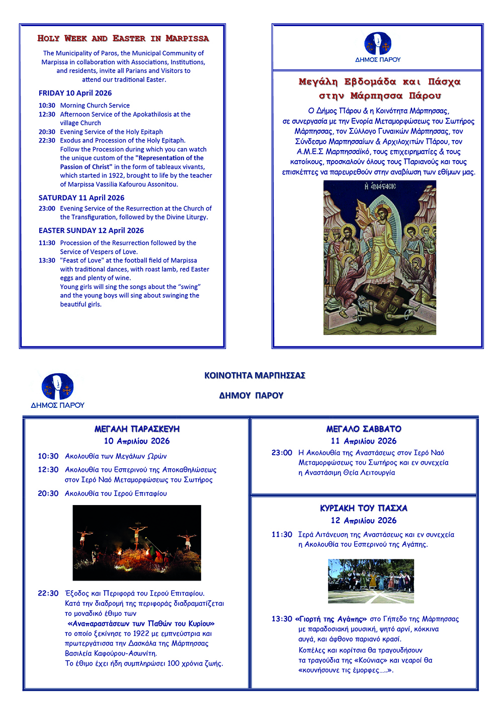Και αν την Μ. Παρασκευή ακολουθήσετε την περιφορά του Επιταφίου στην Μάρπησσα της Πάρου, η ρίγανη, το φασκόμηλο και το δενδρολίβανο θα σας ταξιδέψουν σε παιδικές αναμνήσεις και το έθιμο των Αναπαραστάσεων θα σας γεμίσει με θρησκευτική κατάνυξη. Μετά το «έραναν τον Τάφο οι μυροφόρες μύρο», η εκκλησία της Μεταμόρφωσης του Σωτήρος στην Μάρπησσα γεμίζει με ροδοπέταλα που πέφτουν από ψηλά και το πλήθος ετοιμάζεται να ακολουθήσει την περιφορά του επιταφίου. Τα φώτα σβήνουν και τα στενά σοκάκια του βυζαντινού – μεσαιωνικού οικισμού του 14 ου αι γεμίζουν με τη φλόγα των κεριών και τους ύμνους των πιστών. Και εκεί που η μαγεία κορυφώνεται είναι όταν το βλέμμα αρχίζει και αντικρύζει βυζαντινές εικόνες να παίρνουν ζωή μέσα από τους νέους του χωριού. Αντίκρυ στην ξερολιθιά η «Ανάσταση του Λαζάρου», ενώ πιο κάτω στο κατάφυτο χωράφι με τις μαργαρίτες «Η είσοδος στα Ιεροσόλυμα» με τον ατίθασο γαϊδαράκο να κλέβει την παράσταση.