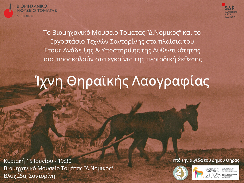 Το Βιομηχανικό Μουσείο Τομάτας “Δ. Νομικός” και το Εργοστάσιο Τεχνών Σαντορίνης, υπό την αιγίδα του Δήμου Θήρας, παρουσιάζουν την περιοδική έκθεση «Ίχνη Θηραϊκής Λαογραφίας», στο πλαίσιο του «Έτους Ανάδειξης & Υποστήριξης της Αυθεντικότητας».