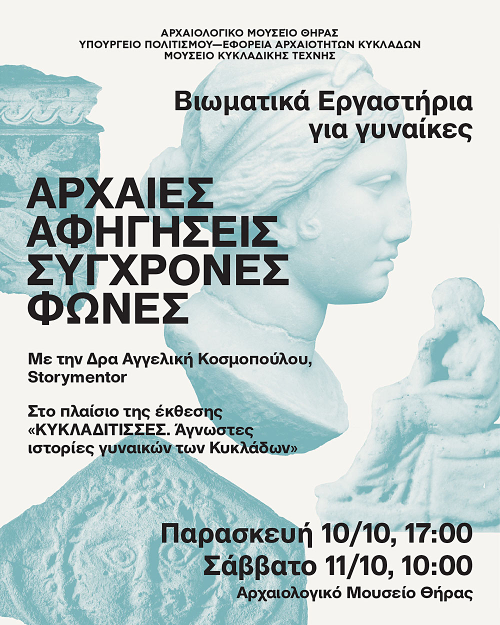 Με αφορμή την έκθεση «Κυκλαδίτισσες: Άγνωστες ιστορίες γυναικών των Κυκλάδων» στο Αρχαιολογικό Μουσείο της Θήρας το Μουσείο Κυκλαδικής Τέχνης διοργανώνει: Βιωματικά εργαστήρια για τις γυναίκες της Σαντορίνης με δωρεάν είσοδο την Παρασκευή 10 και Σάββατο 11 Οκτωβρίου & Δράσεις για τους μαθητές και τους εκπαιδευτικούς του νησιού Πέμπτη 9 και Παρασκευή 10 Οκτωβρίου