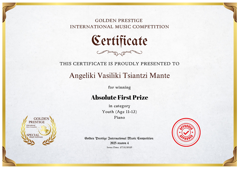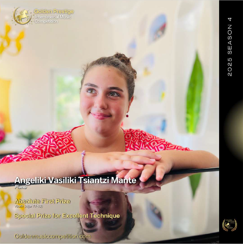 Σημαντικότατες διεθνείς επιτυχίες σημείωσε σε διάστημα μόλις ενός μήνα, η 13χρονη πιανίστρια Αγγελίνα Τσιαντζή Μαντέ από τη Σαντορίνη, κατακτώντας το Χρυσό Μετάλλιο σε τέσσερις διεθνείς μουσικούς διαγωνισμούς και επιβεβαιώνοντας το εξαιρετικά υψηλό καλλιτεχνικό της επίπεδο σε πολύ νεαρή ηλικία.
