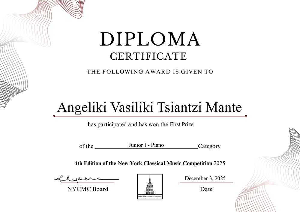 Μετά τις επιτυχίες της στην Ευρώπη, ακολούθησε ο θρίαμβος στην Αμερική, όπου η νεαρή  Αγγελίνα κατέκτησε το 1ο Βραβείο στον διεθνή διαγωνισμό New York Classical Music Competition (NYCMC) 2025, αποδεικνύοντας για μία ακόμη φορά τη δυναμική της παρουσία σε διεθνές επίπεδο.