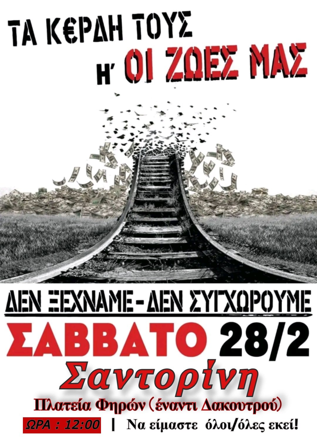 Στη συνέχεια, στις 12:00 μ.μ., θα ακολουθήσει συγκέντρωση στην Πλατεία Φηρών Σαντορίνης, στο πλαίσιο του πανελλαδικού καλέσματος του Συλλόγου Συγγενών Θυμάτων Τεμπών, μαζί με εργατικά κέντρα, σωματεία εργαζομένων, φοιτητικούς συλλόγους και μαζικούς φορείς σε όλη τη χώρα.
