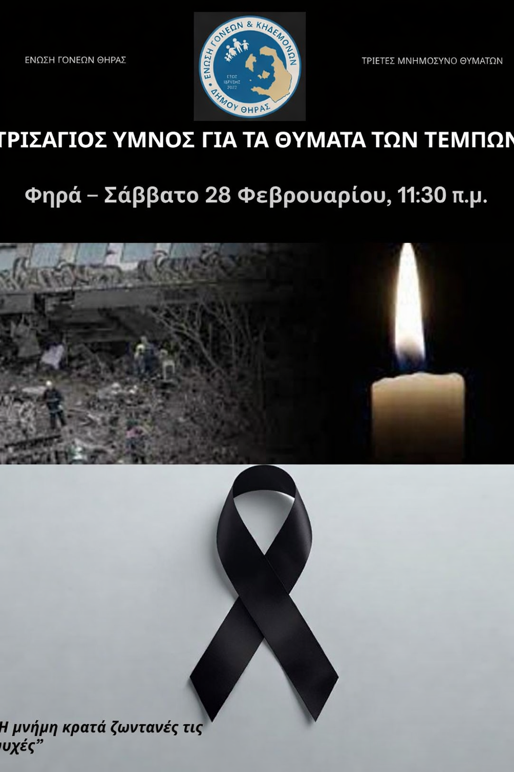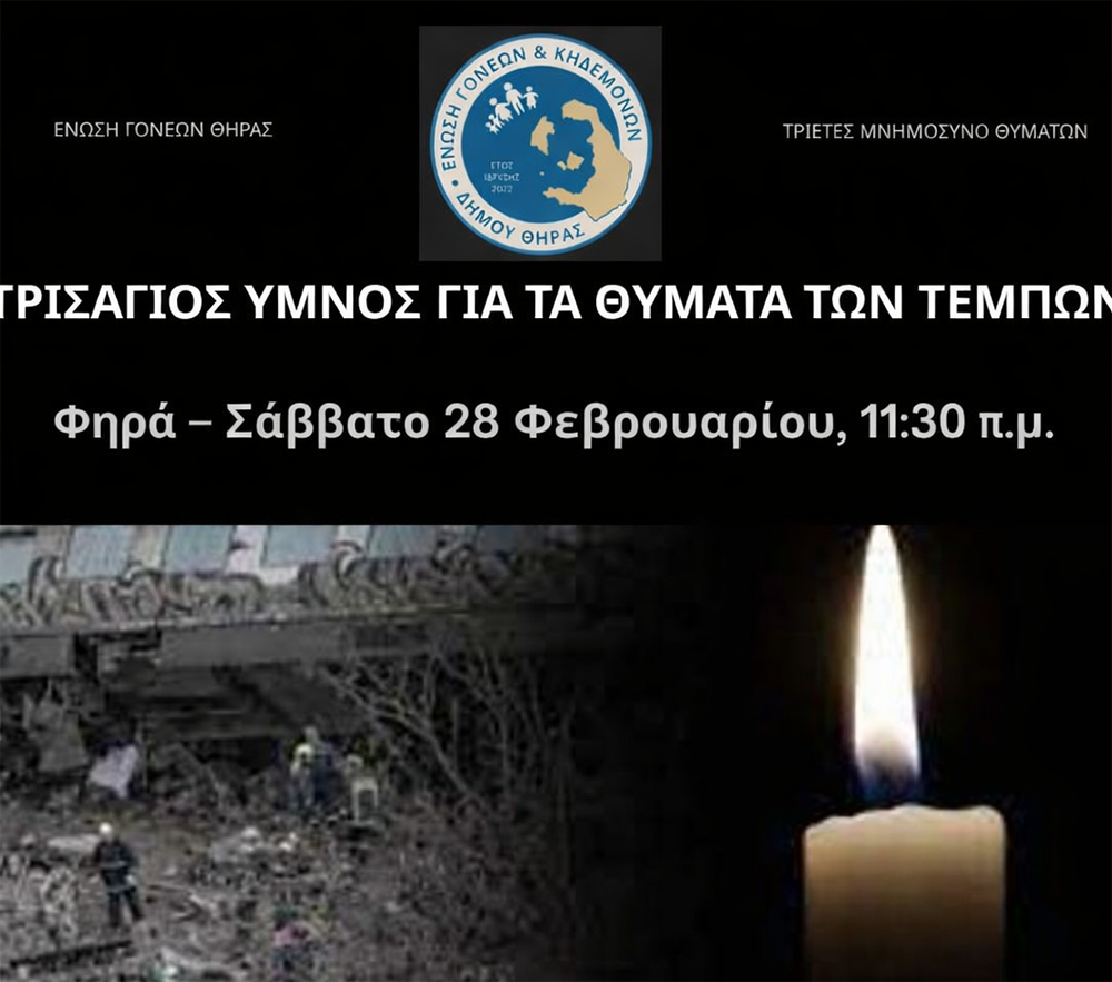 Η Ένωση Συλλόγων Γονέων και Κηδεμόνων Δήμου Θήρας, όπως κάθε χρόνο, έτσι και φέτος διοργανώνει το τριετές μνημόσυνο για τα θύματα της τραγωδίας των Τεμπών και καλεί σε μαζική συμμετοχή στις κινητοποιήσεις μνήμης και διεκδίκησης.