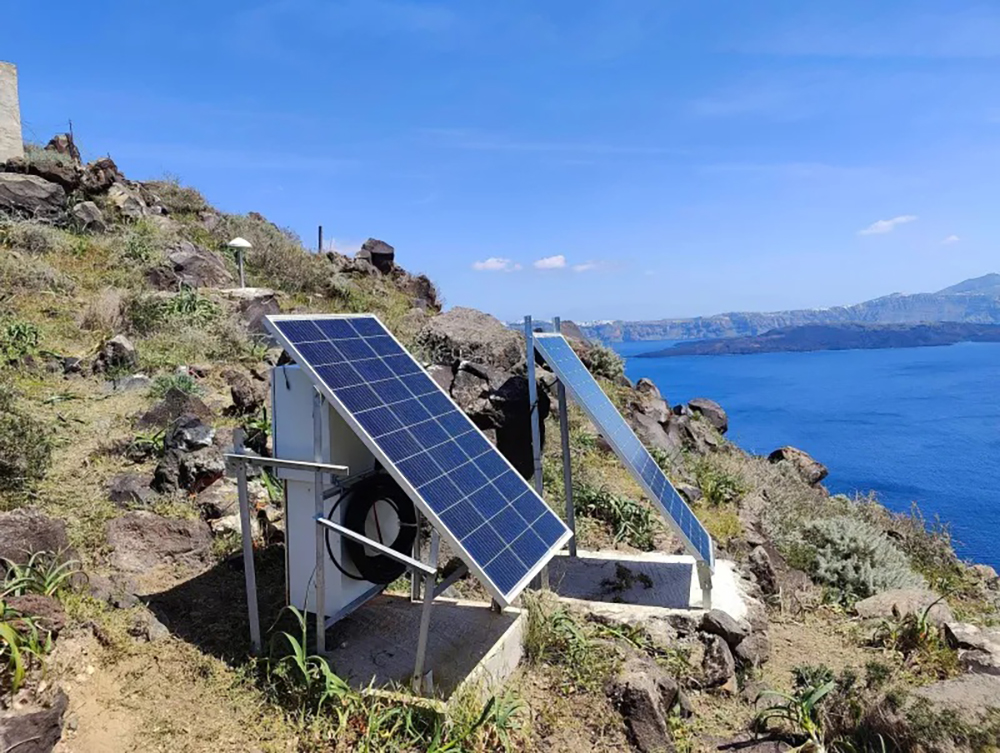 Καλώδια, φωτοβολταϊκά πάνελ και τοπογραφικά όργανα που μοιάζουν με τηλεσκόπια και μετρούν γωνίες και αποστάσεις «αγκαλιάζουν» την καλντέρα