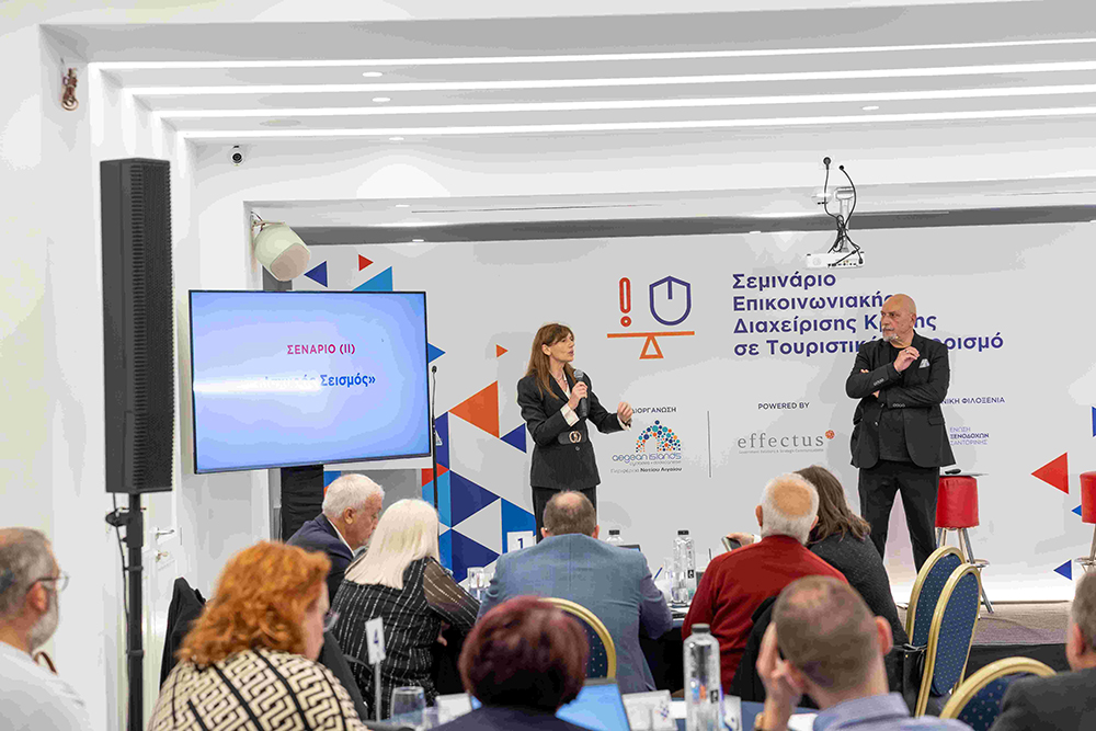 Η καινοτομία του συγκεκριμένου διαδραστικού σεμιναρίου, που διοργάνωσε η εξειδικευμένη εταιρεία “effectus”, έγκειται στο ότι χρησιμοποιεί τη δύναμη της εικόνας για την προσομοίωση των πραγματικών συνθηκών της κρίσης, μεγιστοποιώντας έτσι τα εκπαιδευτικά οφέλη για τους συμμετέχοντες. Τα σενάρια που κλήθηκαν να διαχειριστούν επικοινωνιακά οι συμμετέχοντες στο σεμινάριο ήταν τρία: “Δασική πυρκαγιά”, “Σεοσμός” και “Βιαιοπραγία – Απώλεια ζωής επισκέπτη”.