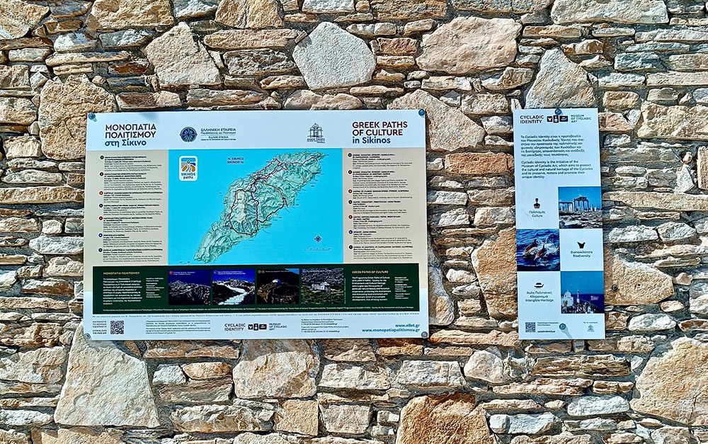 Η εφαρμογή «Μονοπάτια Πολιτισμού Σίκινος», με φορέα υλοποίησης την Ελληνική Εταιρεία Περιβάλλοντος και Πολιτισμού (ΕΛΛΕΤ), είναι ένα ψηφιακό εργαλείο με το οποίο οι επισκέπτες του νησιού έχουν πλέον τη δυνατότητα να περιηγηθούν στα ιστορικά μονοπάτια του, με ασφάλεια, ακρίβεια και εμβάθυνση σε πληροφορίες που αφορούν την πολιτιστική του ταυτότητα. Το δίκτυο των μονοπατιών στη Σίκινο περιλαμβάνει επτά σηματοδοτημένες διαδρομές συνολικού μήκους 56 χιλιομέτρων, που συνδέουν τοπία ιδιαίτερης φυσικής ομορφιάς με αρχαιολογικούς χώρους, ξωκλήσια και παραδοσιακούς οικισμούς.