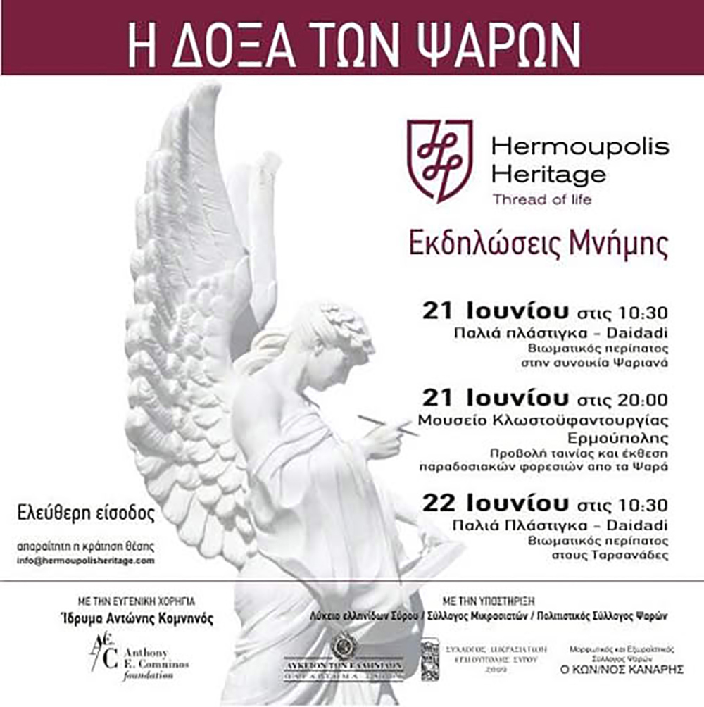 Διήμερο εκδηλώσεων τιμής και μνήμης της 201ης επετείου του Ολοκαυτώματος της Ηρωικής νήσου των Ψαρών διοργανώνει αυτό το Σαββατοκύριακο 21-22 Ιουνίου η Hermoupolis Heritage. Σήμερα με αφετηρία τη παλιά πλάστιγγα θα πραγματοποιήθηκε βιωματικός περίπατος στη συνοικία των Ψαριανών.