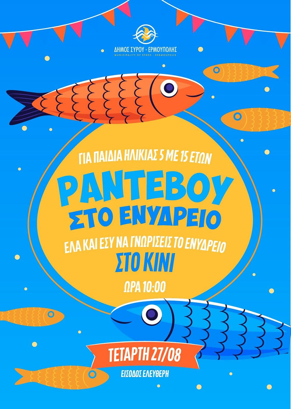 Μετά τις επιτυχημένες εκπαιδευτικές και ψυχαγωγικές εκδηλώσεις του Ιουλίου στο Ενυδρείο του Κινίου, συνεχίζουμε δυναμικά και δημιουργικά τον Αύγουστο και σας περιμένουμε την Τετάρτη 27 Αυγούστου 2025, στις 10:00 π.μ., όπου ο κ. Αχιλλέας Δημητρόπουλος, γνωστός για τη μακρόχρονη προσφορά του στο Βιομηχανικό Μουσείο Ερμούπολης, μαζί με την Αντιδήμαρχο Πολιτισμού κα Θωμαή Μενδρινού, θα υποδεχθούν τα παιδιά στο ενυδρείο για μία περιήγηση στον μαγευτικό κόσμο των ψαριών και των θαλάσσιων οργανισμών που ζουν γύρω από τις ακτές της Σύρου.