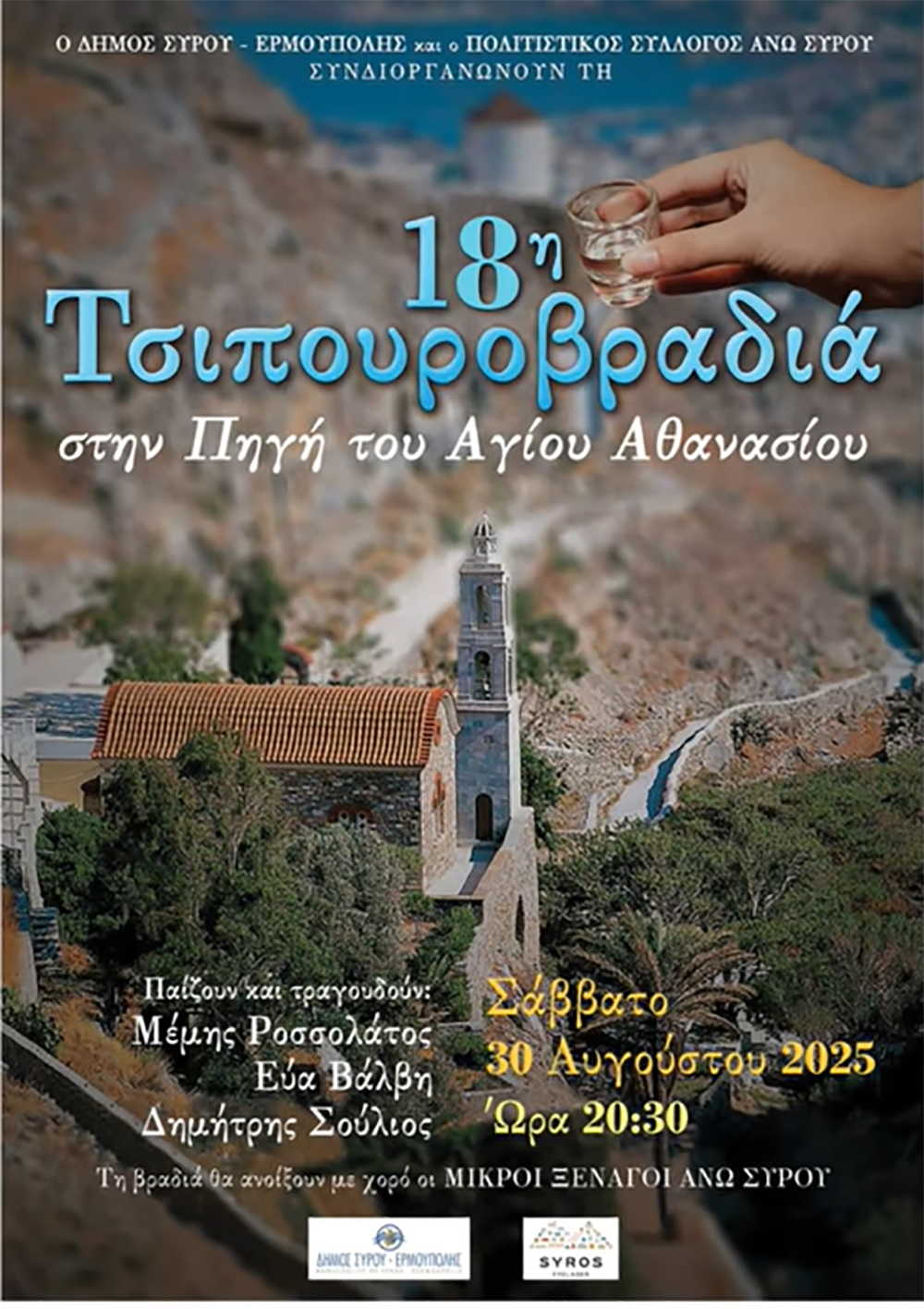 Στην Πηγή του Αγίου Αθανασίου Σύρου πραγματοποιήθηκε η 18η Τσιπουροβραδιά, μια πολιτιστική εκδήλωση που μετράει πολλά χρόνια ζωής και διοργανώνεται από τον Πολιτιστικό Σύλλογο Άνω Σύρου και τον Δήμο Σύρου-Ερμούπολης.