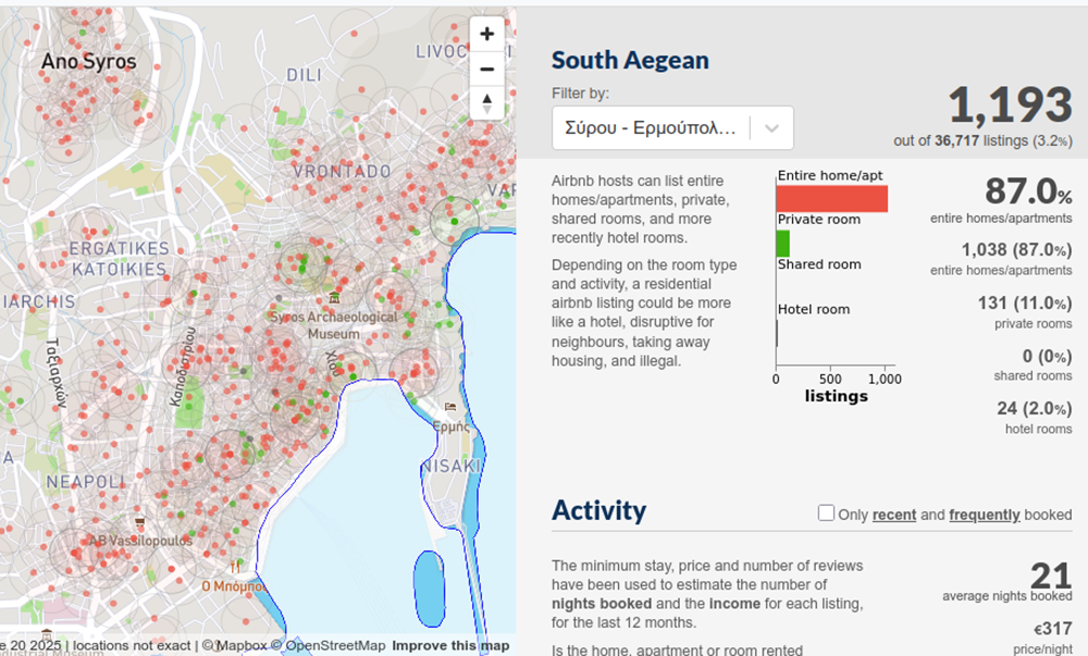 Την ίδια στιγμή σύμφωνα με τα στοιχεία της πλατφόρμας insideairbnb.com, 1038 κατοικίες στο νησί μας είναι δεσμευμένες για βραχυχρόνια μίσθωση, τη στιγμή που νοικιάζονται κατά μέσο όρο μόλις 21 μέρες το χρόνο. Αλλά ποια οικογένεια νέων εργαζομένων μπορεί να εγκαταλείπει την κατοικία της κάθε καλοκαίρι;