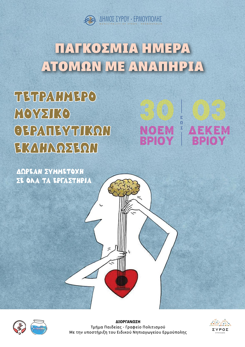 Ο Δήμος Σύρου–Ερμούπολης, στο πλαίσιο της Παγκόσμιας Ημέρας Ατόμων με Αναπηρία (3 Δεκεμβρίου), διοργανώνει ένα ξεχωριστό τετραήμερο μουσικοθεραπευτικών εκδηλώσεων για παιδιά με ειδικές εκπαιδευτικές ανάγκες, με στόχο την ενίσχυση της κοινωνικής ευαισθητοποίησης, την προώθηση της ένταξης και την ανάδειξη της μουσικής ως εργαλείου επικοινωνίας και θεραπείας.