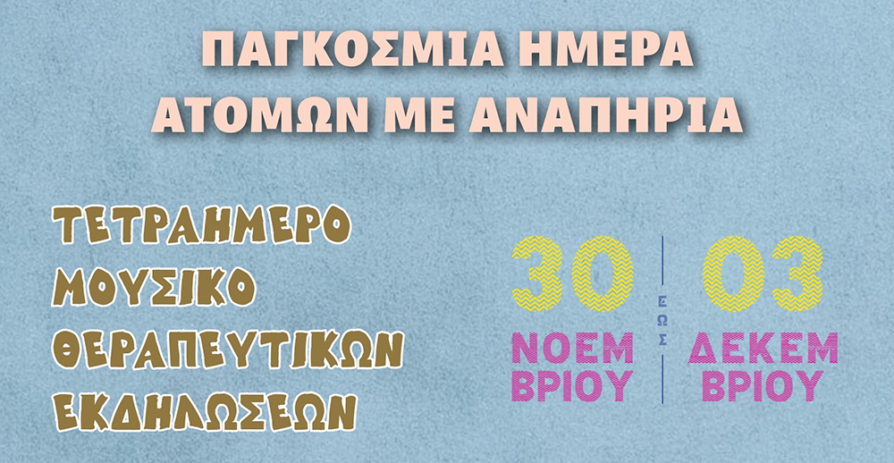 Τετραήμερο μουσικοθεραπευτικών εκδηλώσεων για παιδιά με ειδικές εκπαιδευτικές ανάγκες, για φροντιστές, γονείς, εκπαιδευτικούς, θεραπευτές, και μουσικούς Κυριακή 30 Νοεμβρίου – Τετάρτη 3 Δεκεμβρίου 2025.