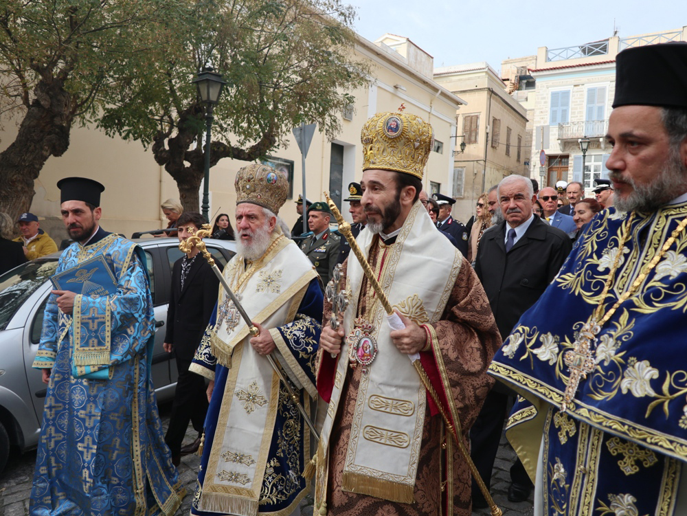 Αφού δε ευχαρίστησε το Υπουργείο ΕΘνικής Άμυνας για τη διάθεση οχήματος προς επιστροφή του Τιμίου Σταυρού στο Μητροπολιτικό Ναό, υπενθύμισε ότι εφέτος τιμάται η 200ή επέτειος από της ιδρύσεως της Ερμουπόλεως, κάλεσε τους παρισταμένους να αναφωνήσουν όπως τότε, οι πρόγονοί τους, στον άθλιο χώρο του Μητροπολιτικού Ναού της ο Μεταμορφώσεως, το όνομα της νεοφύτου πόλεως «Ερμούπολις», «Ερμούπολις», πράγμα το οποίο και ουσιωδώς έπραξαν.