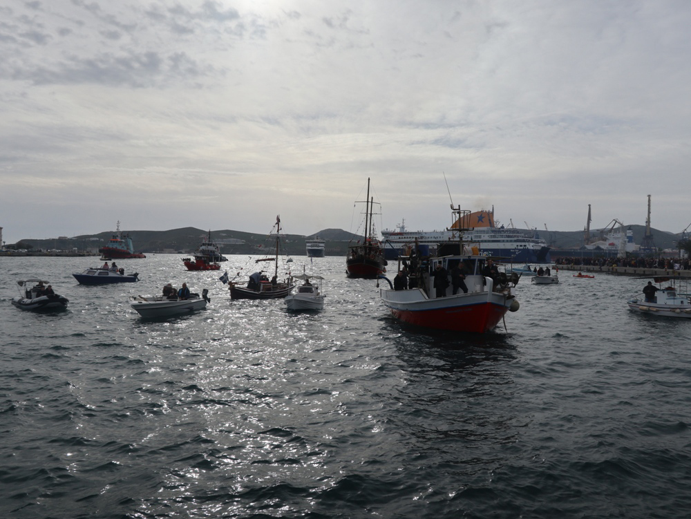 Εν συνεχεία,ο Σεβασμιώτατος κ. Δωρόθεος Β’ επέβη σκάφους του Λιμενικού Σώματος, από την πλώρη του οποίου έρριψε το Σταυρό στη θάλασσα, τον οποίο έσπευσαν τολμηροί νέοι, μεταξύ των οποίων και πενταετές παιδί, και τον οποίο ανέσυρε ο κ. Βασιλ. Κορφιάτης, υπό τα χειροκροτήματα των παρισταμένων, τους εορταστικούς ελιγμούς των μόλις καταπλευσάντων επιβατικών πλοίων «BLUE STAR PAROS» και «BLUE STAR MYKONOS», τους πανηγυρικούς συριγμούς των Ρυμουλκών του Λιμένος Σύρου αγγελματιών και Ερασιτεχνών Αλιέων, του Ομίλου Φουσκωτών και Ταχυπλόων Σκαφών Σύρου και του Σωματείου Λεμβούχων και Καβοδετών Σύρου, και υπό τις χαρμόσυνες κωδωνοκρουσίες, δημιουργώντας μια μεγαλειώδη εορταστική ατμόσφαιρα, που απέδειξε, όπως είπε ο Σεβασμιώτατος κ. Δωρόθεος Β’ ότι η Ερμούπολη είναι και αξίζει να είναι η Πρωτεύουσα πόλη των Κυκλάδων και της Περιφέρειας Ν. Αιγαίου.