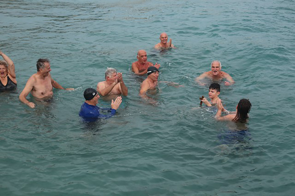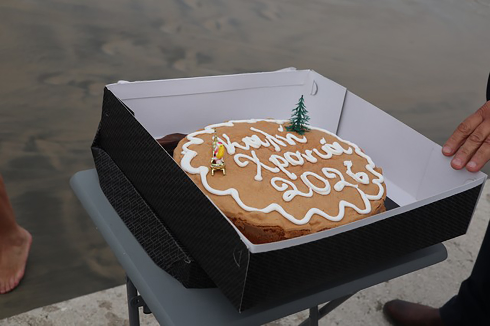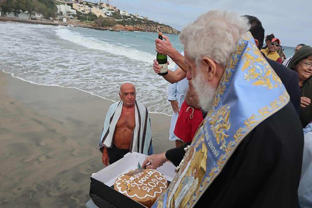 Μετά το πέρας της τελετής ο Σεβασμιώτατος κ. Δωρόθεος Β’ μετέβη στην παραλία της Αζολίμνου, όπου έρριψε ωσαύτως τον Τίμιο Σταυρό στη θάλασσα και ευλόγησε την Αγιοβασιλειόπιτα του Συλλόγου Χειμερινών Κολυμβητών, του οποίου και αποτελεί μέλος.