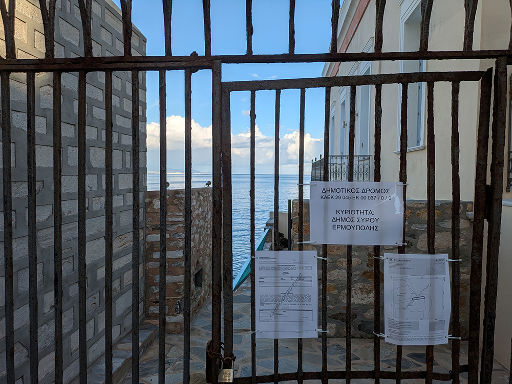 Στη καγκελόπορτα που έχει τοποθετηθεί στο σημείο, θυροκολλήθηκαν αποσπάσματα κτηματογραφικών εγγράφων τα οποία επιβεβαιώνουν ότι ο συγκεκριμένος δρόμος αποτελεί δημοτική οδό και βρίσκεται υπό την κυριότητα του Δήμου Σύρου – Ερμούπολης.