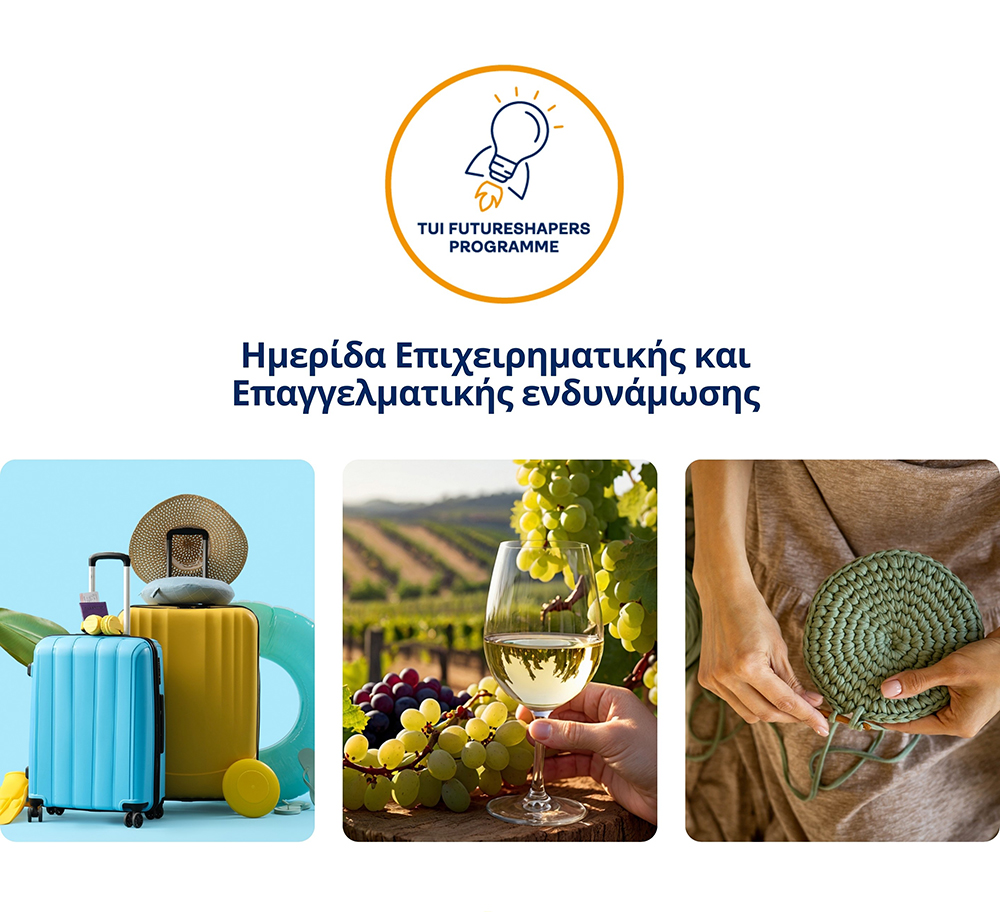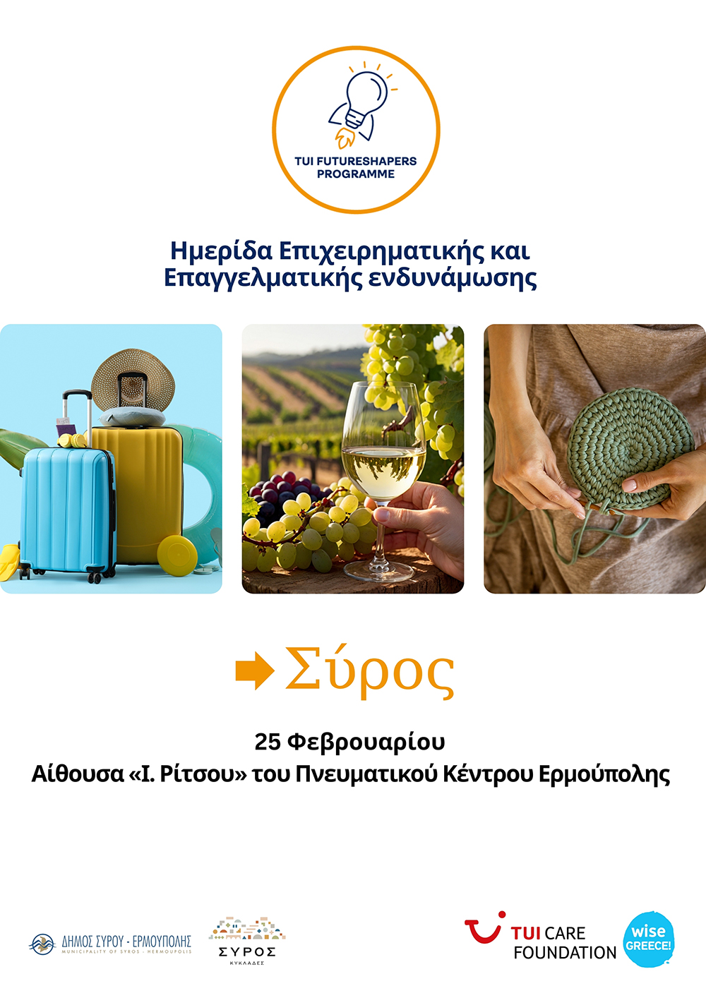 Η Wise Greece, με την υποστήριξη του TUI Care Foundation και σε συνεργασία με το τμήμα Τουρισμού του Δήμου Σύρου-Ερμούπολης, σας προσκαλεί στην Ημερίδα Επιχειρηματικής και Επαγγελματικής Ενδυνάμωσης – μια μοναδική ευκαιρία για επαγγελματίες ή επιχειρηματίες να ενισχύσουν τις γνώσεις και τις δεξιότητές τους.