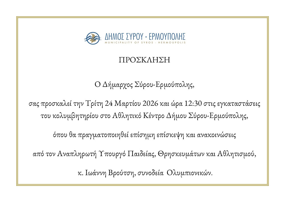 Ο Δήμαρχος Σύρου – Ερμούπολης προσκαλεί του πολίτες στις εγκαταστάσεις του κολυμβητηρίου στο Αθλητικό Κέντρο Δήμου Σύρου-Ερμούπολης στις 12:30, όπου θα πραγματοποιηθεί επίσημη επίσκεψη και ανακοινώσεις από τον Αναπληρωτή Υπουργό Παιδείας, Θρησκευμάτων και Αθλητισμού κ. Ιωάννη Βρούτση, συνοδεία Ολυμπιονικών.