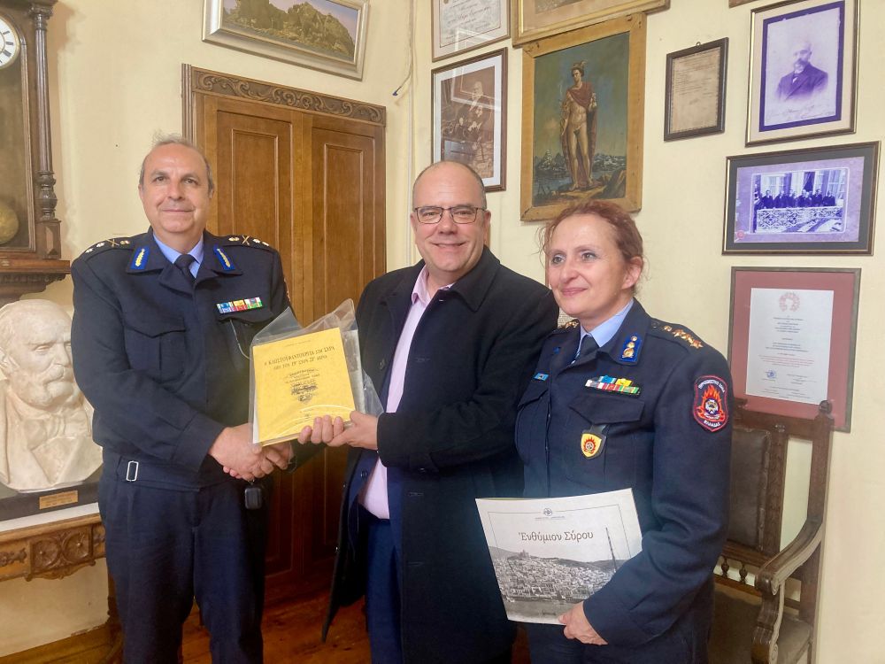 Εθιμοτυπική συνάντηση με τον νέο Συντονιστή Επιχειρήσεων Βορείου, Νοτίου Αιγαίου και Κρήτης, Υποστράτηγο κ. Μιχαήλ Σεληνιωτάκη, και τη Διοικήτρια Πυροσβεστικών Υπηρεσιών Κυκλάδων, Πύραρχο Γεωργία Τσάφου, πραγματοποίησε σήμερα, Πέμπτη 16 Απριλίου 2026, ο Δήμαρχος Σύρου – Ερμούπολης κ. Αλέξανδρος Αθανασίου. Στη συνάντηση, η οποία έλαβε χώρα στο Δημαρχιακό Μέγαρο, παρέστησαν επίσης υπηρεσιακοί παράγοντες της Πυροσβεστικής Υπηρεσίας Σύρου και Κρήτης.