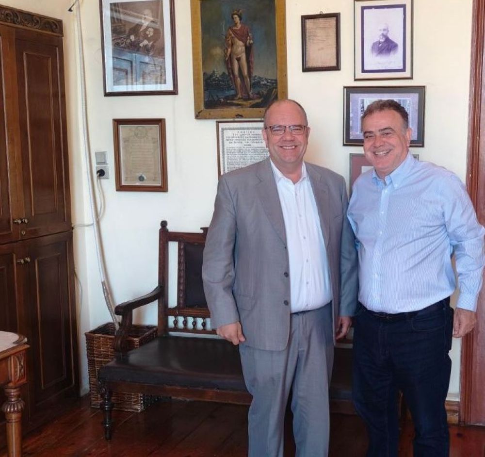 Την Κυριακή 19 Απριλίου 2026, ο Δήμαρχος Σύρου – Ερμούπολης, κ. Αλέξανδρος Αθανασίου, υποδέχθηκε στο Δημαρχιακό Μέγαρο τον Δήμαρχο Παλλήνης, κ. Χρήστο Αηδόνη. Η συνάντηση πραγματοποιήθηκε στο πλαίσιο της επίσκεψης του κ. Αηδόνη κατόπιν πρόσκλησης από τον Χωρικό Αντιπεριφερειάρχη Κυκλάδων της Περιφέρειας Ν. Αιγαίου και Πρόεδρο της Ελλάς Σύρου, κ. Γεώργιο Λεονταρίτη.