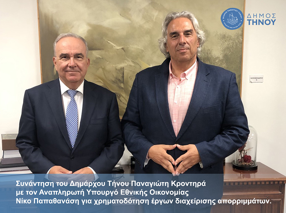 Σε μια σημαντική συνάντηση εργασίας που πραγματοποιήθηκε στην Αθήνα, ο Δήμαρχος Τήνου Παναγιώτης Κροντηράς, συναντήθηκε με τον Αναπληρωτή Υπουργό Εθνικής Οικονομίας κ. Νίκο Παπαθανάση. Στη συνάντηση παρών ήταν και ο Γενικός Γραμματέας Διαχείρισης Τομεακών Προγραμμάτων ΕΤΠΑ, ΤΣ και ΕΚΤ στο Υπουργείο Οικονομικών, κ. Β. Σιαδήμας.