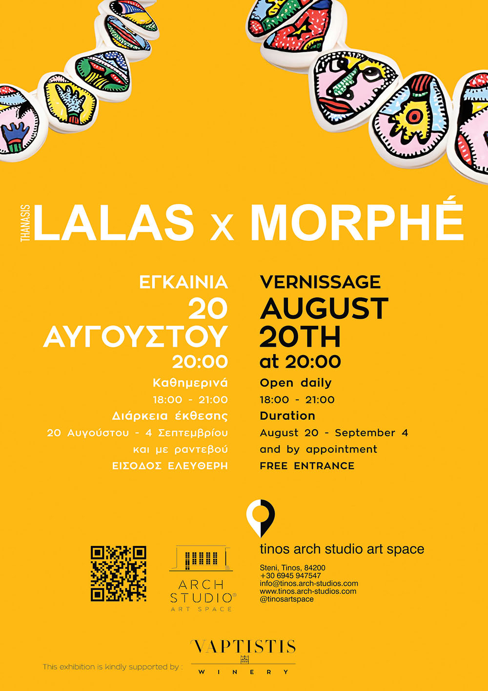 Τα εγκαίνια θα πραγματοποιηθούν την Τέταρτη 20 Αυγούστου στις 20:00, στον εκθεσιακό χώρο του Arch Studio στο Στενή Τήνου. Η έκθεση θα διαρκέσει έως τις 4 Σεπτεμβρίου 2025.
