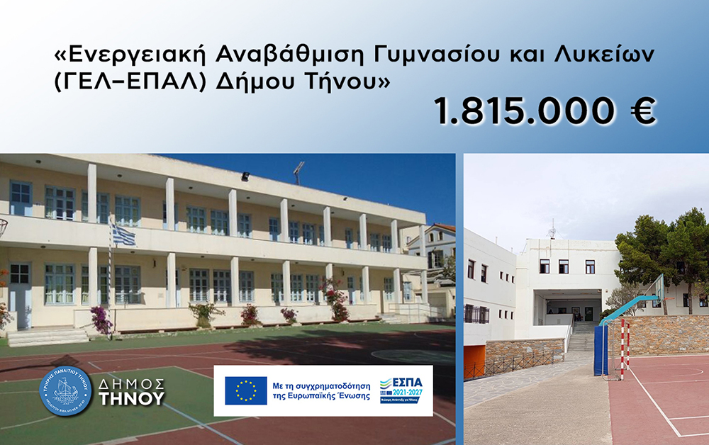 Η Τήνος γυρίζει σελίδα στις σχολικές υποδομές. Μια νέα εποχή ξημερώνει για την εκπαίδευση, καθώς ο Δήμος Τήνου εξασφάλισε τη χρηματοδότηση του έργου: «Ολοκληρωμένη Αναβάθμιση του κτιρίου του Γυμνασίου και του κτιρίου των Λυκείων» του νησιού. Πρόκειται για μία κομβικής σημασίας παρέμβαση συνολικού προϋπολογισμού 1.815.000,00 €, η οποία χρηματοδοτείται εξ ολοκλήρου από ευρωπαϊκούς πόρους της Περιφέρειας Νοτίου Αιγαίου.