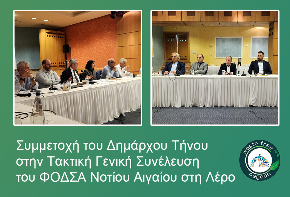 Επίσης έγινε ενημέρωση για τη δράση του Υπουργείου Περιβάλλοντος και Ενέργειας με φορέα υλοποίησης το ΦΟΔΣΑ Νοτίου Αιγαίου που αφορά την ενίσχυση των Νησιωτικών Ο.Τ.Α. α΄ βαθμού της Επικράτειας, με μόνιμο πληθυσμό από χίλιους τετρακόσιους (1.400) έως δέκα χιλιάδες (10.000) κατοίκους, με μέσα προσωρινής αποθήκευσης και υπηρεσίες για την υλοποίηση συστημάτων χωριστής συλλογής, διαλογής και διαχείρισης ρευμάτων ανακυκλώσιμων υλικών, συμπεριλαμβανομένων των αποβλήτων συσκευασίας που εμπίπτουν στη διευρυμένη ευθύνη του παραγωγού, των βιοαποβλήτων (αποβλήτων τροφίμων) και έντυπου χαρτιού – χαρτονιού, καθώς και για την αξιοποίηση αυτών εντός και εκτός των διοικητικών ορίων έκαστου Δήμου, δράση στην οποία συμμετέχει και ο Δήμος της Τήνου και συμφωνα με την ενημέρωση που έγινε θα ξεκινήσει μέσα στο 2026.