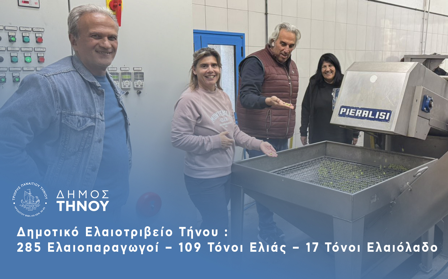 Ολοκληρώθηκε η φετινή περίοδος λειτουργίας του ελαιοτριβείου του Δήμου Τήνου, από τη –υπό εκκαθάριση– Δημοτική Επιχείρηση, το οποίο εξυπηρέτησε 285 ελαιοπαραγωγούς, όχι μόνο από το νησί μας, αλλά και από τα γειτονικά νησιά. Κατά την περίοδο από τις 17 Οκτωβρίου έως και τις 2 Δεκεμβρίου 2025, επεξεργάστηκαν συνολικά 109 τόνοι ελιάς, παράγοντας 17 τόνους ελαιόλαδου.