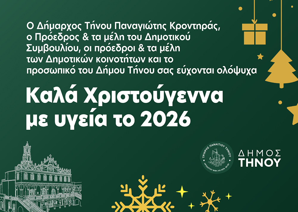 Ο Δήμαρχος Τήνου και η Δημοτική Αρχή εύχονται σε όλες τις συμπολίτισσες και όλους τους συμπολίτες Καλά Χριστούγεννα και καλές γιορτές, με υγεία, γαλήνη και ζεστασιά σε κάθε σπίτι.