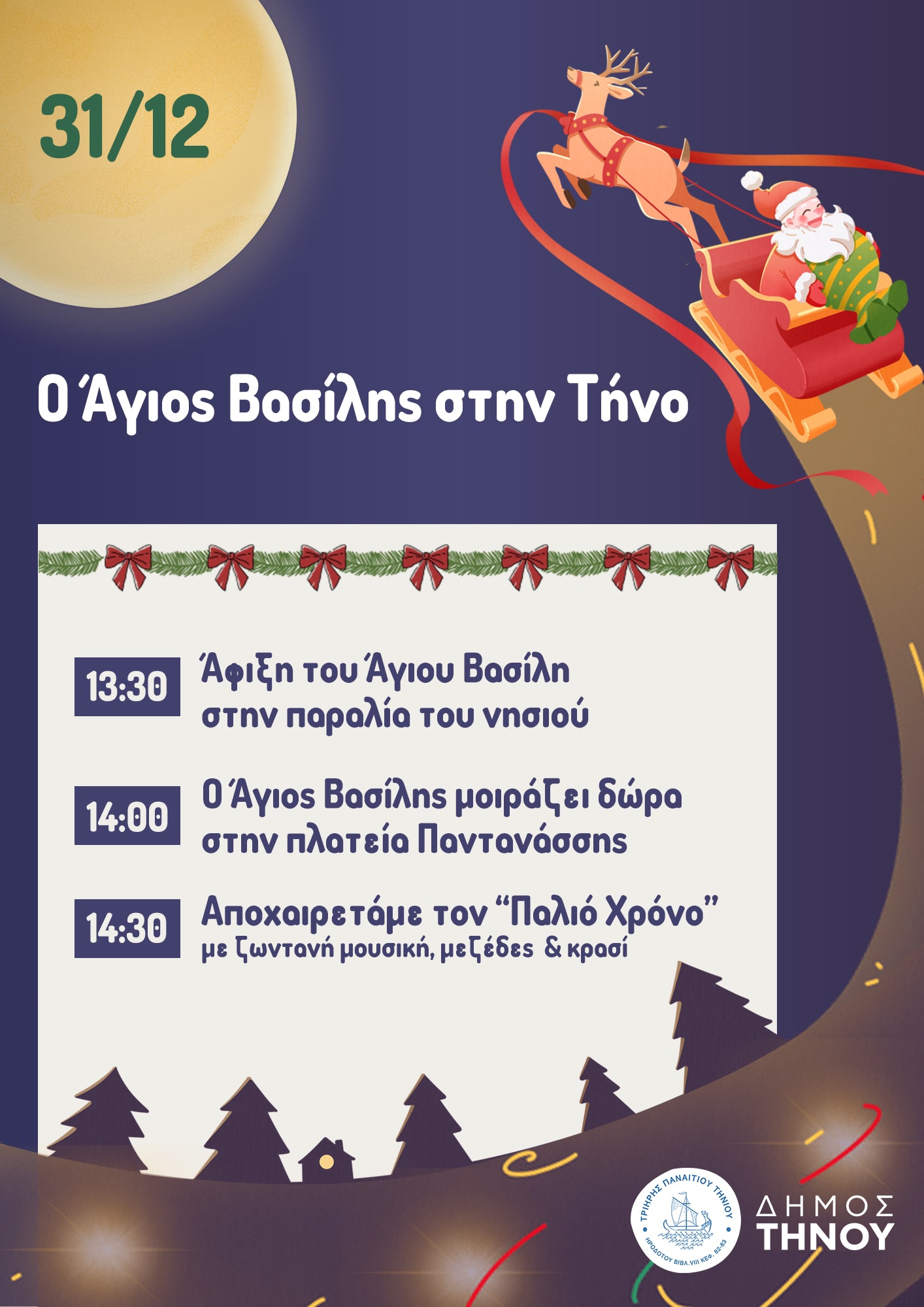 Γιορτινή εκδήλωση για μικρούς και μεγάλους, με αφορμή την υποδοχή του Αγίου Βασίλη και τον αποχαιρετισμό του έτους που φεύγει, διοργανώνει ο Δήμος Τήνου την Τετάρτη 31 Δεκεμβρίου 2025. Όπως αναφέρεται στη σχετική ανακοίνωση του Δήμου, η παραλία και η πλατεία Παντανάσσης θα φιλοξενήσουν ένα εορταστικό πρόγραμμα με μουσική, δώρα για τα παιδιά και ζωντανό γλέντι, σε μια ανοιχτή εκδήλωση για κατοίκους και επισκέπτες του νησιού.