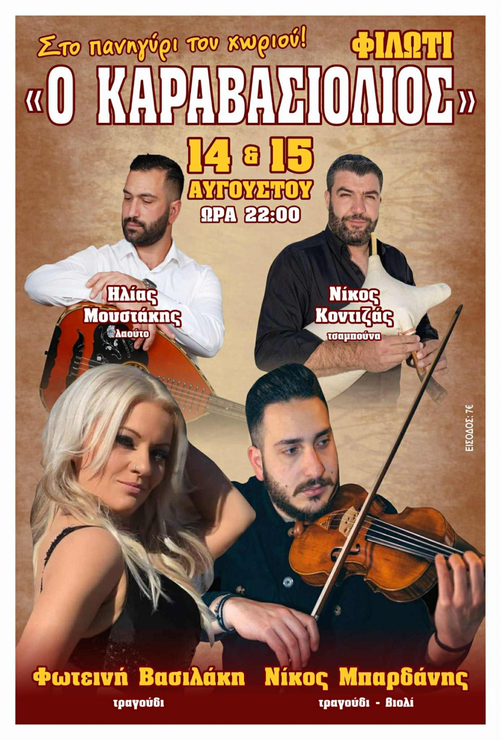 Κάθε χρόνο, από το 1992, «ο Καραβασιολιός» ζωντανεύει με έναν ξεχωριστό τρόπο τον Δεκαπενταύγουστο. Το πανηγύρι που διοργανώνεται εκεί, έχει γίνει πια θεσμός και όχι μόνο για το Φιλώτι. Είναι μια γιορτή που ενώνει τον κόσμο με το νησί, τη μουσική με τη γη, τη γεύση με την ψυχή.