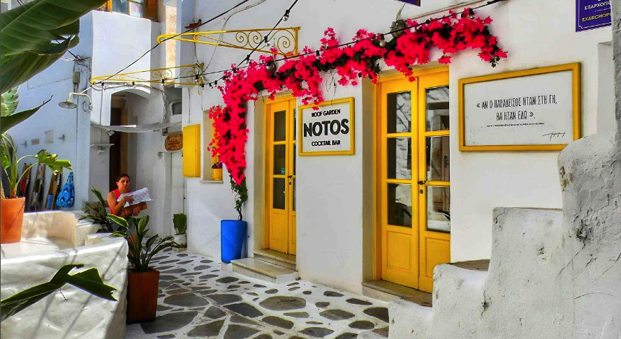 Το NOTOS είναι από εκείνα τα μέρη που νιώθεις πώς έχουν ιστορία, με τοπικές γεύσεις, κοκτέιλ και μια αυλή που σε παρασύρει να μείνεις λίγο ακόμη. Άλλοτε κάθεσαι στο στενό, άλλοτε στο roof garden, πάντα με θέα και μια ατμόσφαιρα που σου ψιθυρίζει ότι βρίσκεσαι στις Κυκλάδες.