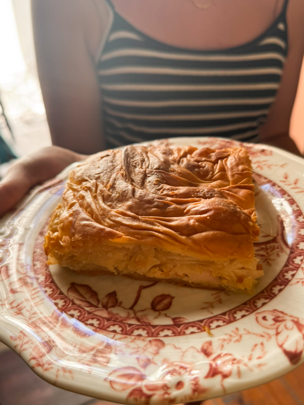 Στο τέλος κατέληξα στο γαλακτομπούρεκο, εκεί έμαθα πως το φτιάχνουν με το φρέσκο γάλα του κυρ-Στέλιου, του πατέρα της οικογένειας, μια μπουκιά μόνο και κατάλαβα γιατί όλοι μιλάνε γι’ αυτό.