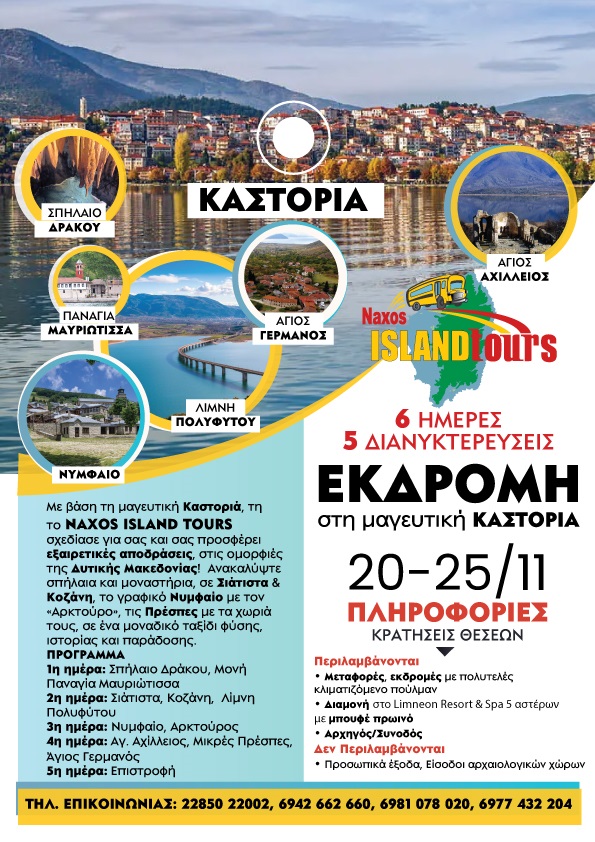 Το Naxos Island Tours σε ταξιδεύει 20-25 Νοεμβρίου 2025 σε μια πενθήμερη απόδραση που τα έχει όλα: Τη γοητεία της Καστοριάς, το νεολιθικό μυστήριο του Δισπηλιού, το μαγικό Σπήλαιο του Δράκου, την κατανυκτική ομορφιά της Μονής Παναγίας Μαυριώτισσας και την αρχοντιά του Ντολτσό.