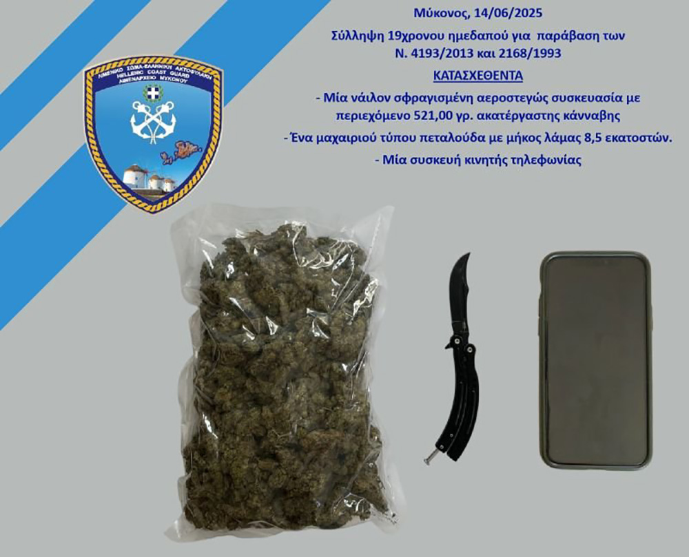 Συγκεκριμένα, σε έλεγχο που διενεργήθηκε στο νέο λιμένα Μυκόνου μετά τον κατάπλου ενός επιβατηγού-οχηματαγωγού (Ε/Γ-Ο/Γ) πλοίου προερχόμενου από το λιμάνι του Πειραιά, εντοπίστηκε ο ανωτέρω να κατέχει μία νάιλον σακούλα αεροστεγώς σφραγισμένη, περιέχουσα φυτικά αποσπάσματα ακατέργαστης κάνναβης συνολικού μεικτού βάρους 521 γρ. και ένα μαχαίρι τύπου ¨πεταλούδα¨ με μήκος λάμας 8,5 εκ. Από το Λιμεναρχείο Μυκόνου που διενεργεί την προανάκριση, κατασχέθηκαν τα ανωτέρω ανευρεθέντα και μία συσκευή κινητής τηλεφωνίας.