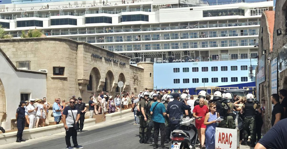 Ηλεκτρισμένο ήταν το κλίμα στο λιμάνι της Ρόδου, με μερικές δεκάδες συγκεντρωμένους να διαμαρτύρονται για την άφιξη κρουαζιερόπλοιου που μετέφερε πάνω από 650 Ισραηλινούς τουρίστες.