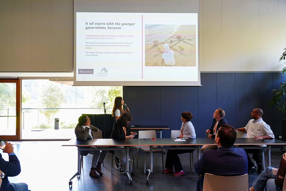 Η Διευθύντρια Επικοινωνίας της Περιφέρειας και συντονίστρια δράσεων Γαστρονομίας, κα Βάσια Παπαηλία παρουσίασε το εκπαιδευτικό πρόγραμμα «Aegean Gardeners», το οποίο λειτουργεί μέσω του Περιφερειακού Φυτωρίου και κάθε χρόνο προσεγγίζει 30 νησιά, 250 σχολεία και 1.500 μαθητές, ενώ από φέτος υιοθετήθηκε από το Υπουργείο Παιδείας ως εθνικό πρόγραμμα με τον τίτλο «Λαχανόκηποι στα Σχολεία».