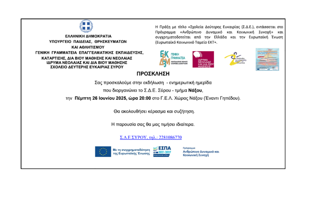 Την Πέμπτη 26 Ιουνίου 2025, στις 20:00, στο χώρο του Γ.Ε.Λ. ΝΑΞΟΥ, στην χώρα Νάξου, το Σχολείο Δεύτερης Ευκαιρίας Σύρου – τμήμα Νάξου θα πραγματοποιήσει εκδήλωση – ενημερωτική ημερίδα με σκοπό την ενημέρωση και ευαισθητοποίηση της τοπικής κοινωνίας, σχετικά με το έργο και τη σημασία των Σχολείων Δεύτερης Ευκαιρίας (ΣΔΕ), το ρόλο που διαδραματίζουν στην ενίσχυση της εκπαίδευσης ενηλίκων και στην καταπολέμηση του κοινωνικού αποκλεισμού.