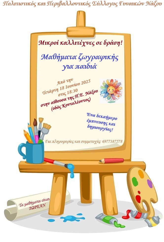 Ο Πολιτιστικός και Περιβαλλοντικός Σύλλογος Γυναικών Νάξου διοργανώνει για άλλη μια χρονιά μαθήματα ζωγραφικής για παιδιά, σε ένα δεκαήμερο αφιερωμένο στην έμπνευση, τη φαντασία και τη δημιουργικότητα.
